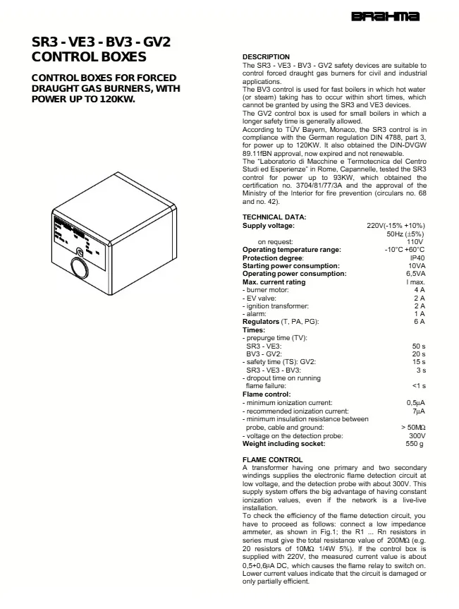 BRAHMA Burner Control – SR Series เป็น Safety Relay สำหรับหัวเผาแก๊ส ที่ทำหน้าที่ควบคุมการจุดระเบิดและตรวจสอบเปลวไฟ เพื่อความปลอดภัยในการทำงานของระบบเผาไหม้ เหมาะสำหรับ Boilers และ Industrial Burners ที่ต้องการความเชื่อถือได้สูง โดยรุ่น SR3 รองรับกำลังหัวเผาสูงสุด ~120 kW