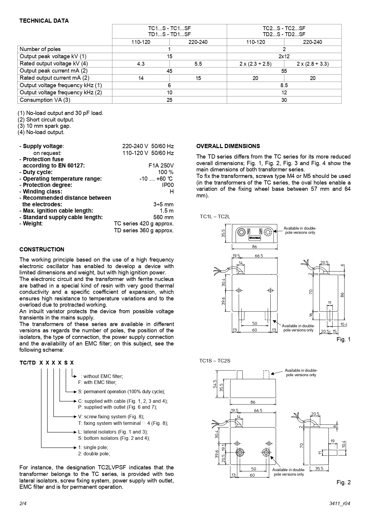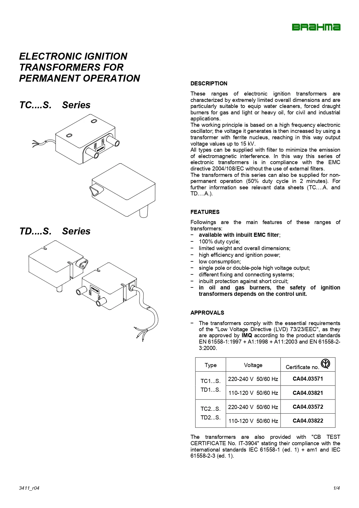 BRAHMA Transformer TD Series (Ignition Transformers – High Voltage for Burner Systems) ขนาดกะทัดรัด ใช้สำหรับหัวเผาแก๊สและน้ำมัน (ทั้งเบาและหนัก) ในงานบ้านและอุตสาหกรรม ออกแบบมาเพื่อสร้างแรงดันสูง สำหรับการจุดระเบิด โดยมีรุ่นย่อยที่รองรับแรงดันไฟฟ้าอินพุตต่าง ๆ