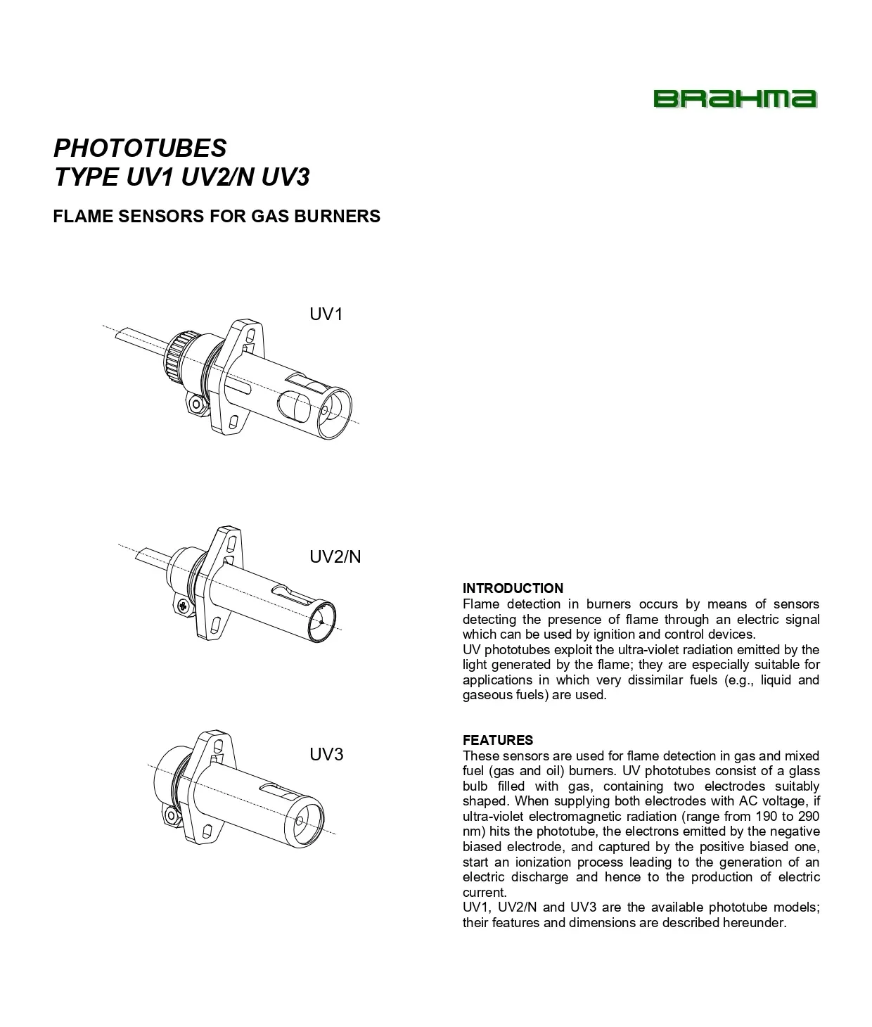 BRAHMA UV Sensor (Ultraviolet Flame Sensor) เป็นเซนเซอร์ตรวจจับเปลวไฟด้วยรังสี UV ที่ออกแบบมาสำหรับหัวเผาแก๊สและน้ำมัน มีรุ่น UV1, UV2, UV3 รองรับการใช้งานที่หลากหลาย เหมาะสำหรับ Boilers, Furnaces และ Heating Systems