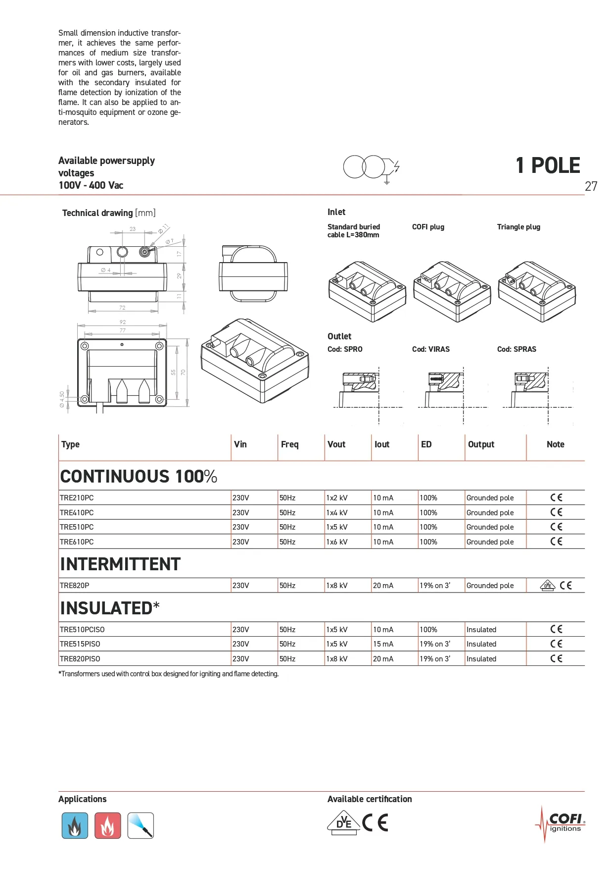 COFI TRE Series (Ignition Transformers – Oil & Gas Burner Ignition) เป็นหม้อแปลงจุดระเบิดแบบ Inductive Conventional Transformer ที่ออกแบบมาสำหรับหัวเผาแก๊สและน้ำมัน รวมถึงงานอุตสาหกรรมอื่น ๆ หรับหัวเผาแก๊สและน้ำมัน (Gas & Oil Burners) โดยให้แรงดันสูงและกระแสที่เสถียร