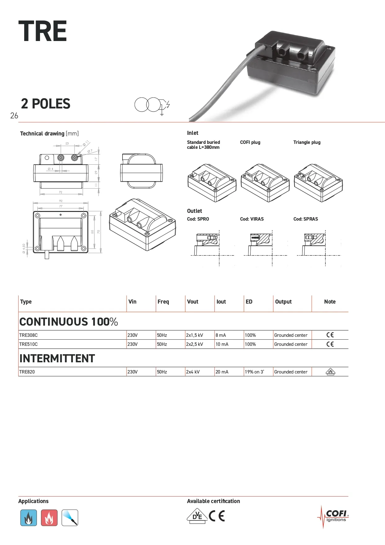 COFI TRE Series (Ignition Transformers – Oil & Gas Burner Ignition) เป็นหม้อแปลงจุดระเบิดแบบ Inductive Conventional Transformer ที่ออกแบบมาสำหรับหัวเผาแก๊สและน้ำมัน รวมถึงงานอุตสาหกรรมอื่น ๆ หรับหัวเผาแก๊สและน้ำมัน (Gas & Oil Burners) โดยให้แรงดันสูงและกระแสที่เสถียร