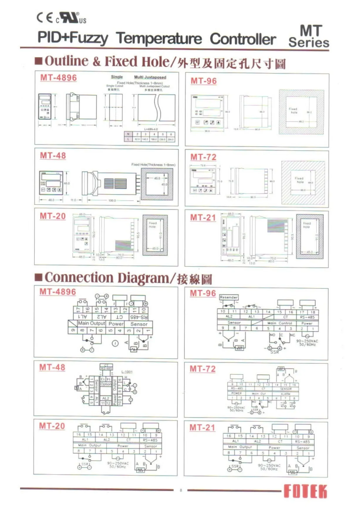 Fotek Controls – Temperature Controller MT Series เป็น Temperature Controller รุ่นหน้าปัดใหญ่เป็นคอนโทรลเลอร์ดิจิทัลที่ใช้ PID + Fuzzy Control รองรับหลายชนิดของเซนเซอร์ที่ใช้ Relay Output เหมาะสำหรับงานอุตสาหกรรมที่ต้องการการควบคุมอุณหภูมิที่แม่นยำและเสถียร รองรับ Thermocouple และ RTD พร้อมฟังก์ชัน Auto‑tuning และ Alarm