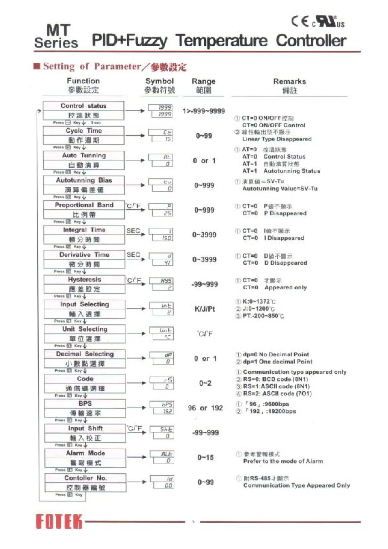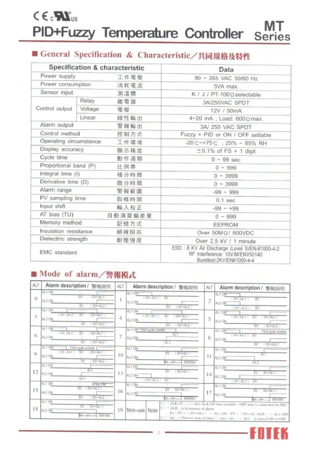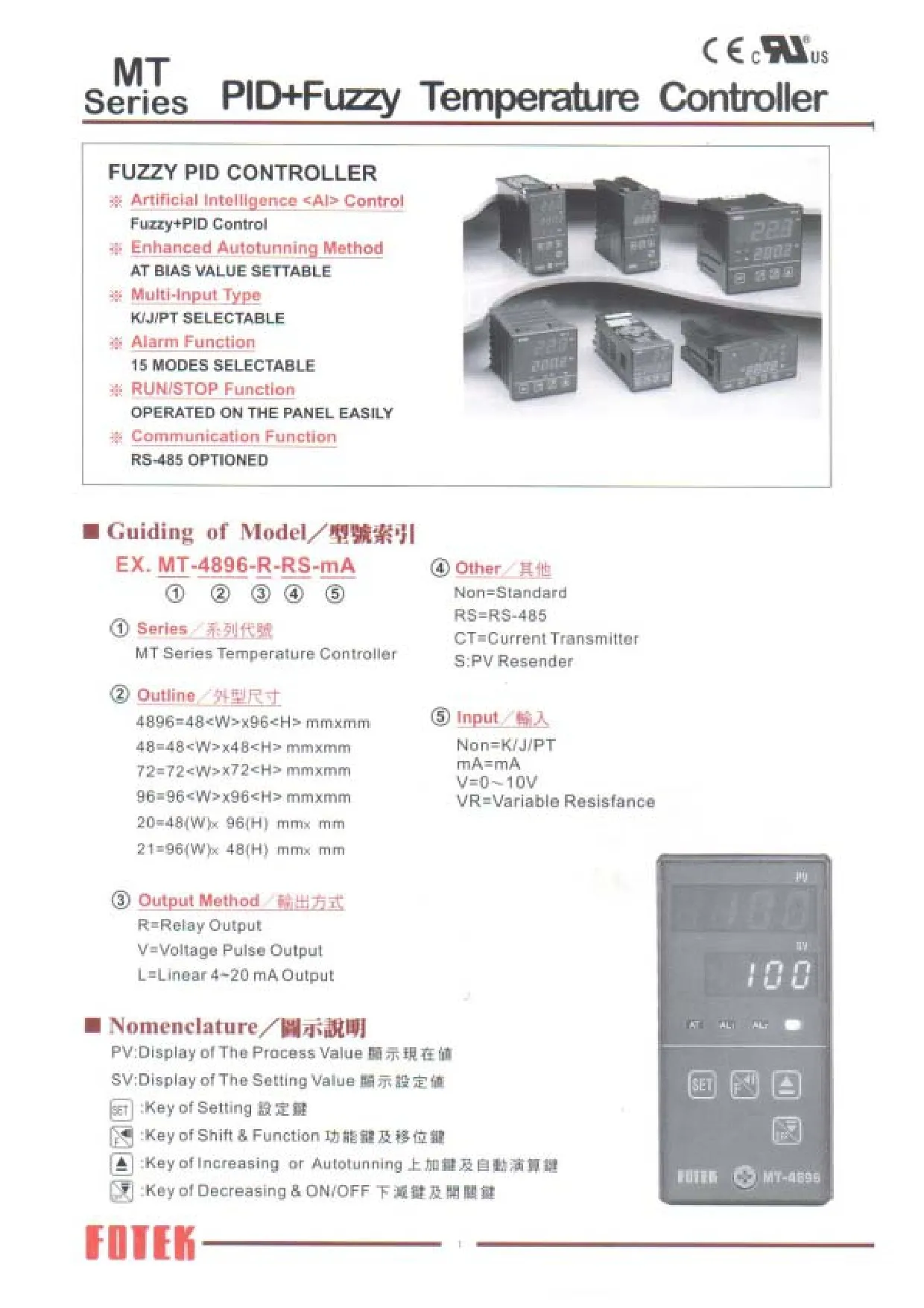 Fotek Controls – Temperature Controller MT Series เป็น Temperature Controller รุ่นหน้าปัดใหญ่เป็นคอนโทรลเลอร์ดิจิทัลที่ใช้ PID + Fuzzy Control รองรับหลายชนิดของเซนเซอร์ที่ใช้ Relay Output เหมาะสำหรับงานอุตสาหกรรมที่ต้องการการควบคุมอุณหภูมิที่แม่นยำและเสถียร รองรับ Thermocouple และ RTD พร้อมฟังก์ชัน Auto‑tuning และ Alarm