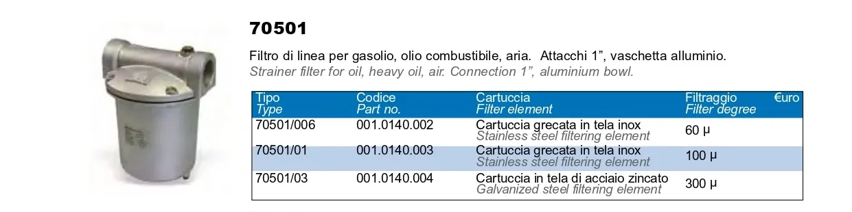 GIULIANI ANELLO – Heavy Oil Filter เป็นตัวกรองแก๊สสำหรับระบบหัวเผาและท่อแก๊สอุตสาหกรรม ผลิตในอิตาลี ใช้กรองสิ่งสกปรกและอนุภาคแข็งออกจากแก๊ส เพื่อป้องกันความเสียหายต่อ Burner, Pressure Regulator และ Solenoid Valve มีหลายรุ่น ครอบคลุมแรงดันใช้งานตั้งแต่ 1 bar ถึง 6 bar และระดับการกรองตั้งแต่ 50 µm ถึง 300 µm