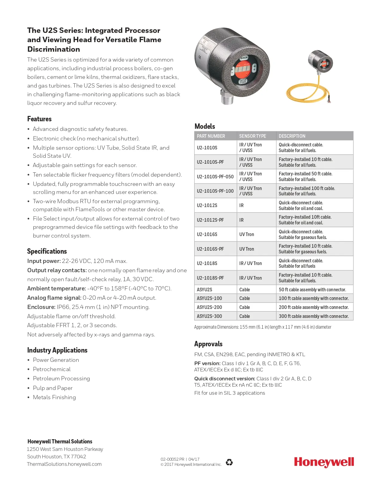 Honeywell Integrated UV Flame Monitor – U2S Series เป็นอุปกรณ์ตรวจจับเปลวไฟแบบ all‑in‑one ที่รวมทั้ง Viewing Head และ Signal Processor ในตัวเดียว เหมาะสำหรับ single หรือ multi‑burner systems ที่ใช้เชื้อเพลิงหลายชนิด (multi‑fuel) และสภาพการทำงานที่ยากต่อการตรวจจับเปลวไฟ โดยมีฟังก์ชัน self‑checking UV/IR sensor, touchscreen interface, และ programmable discrimination เพื่อให้การตรวจจับเปลวไฟ