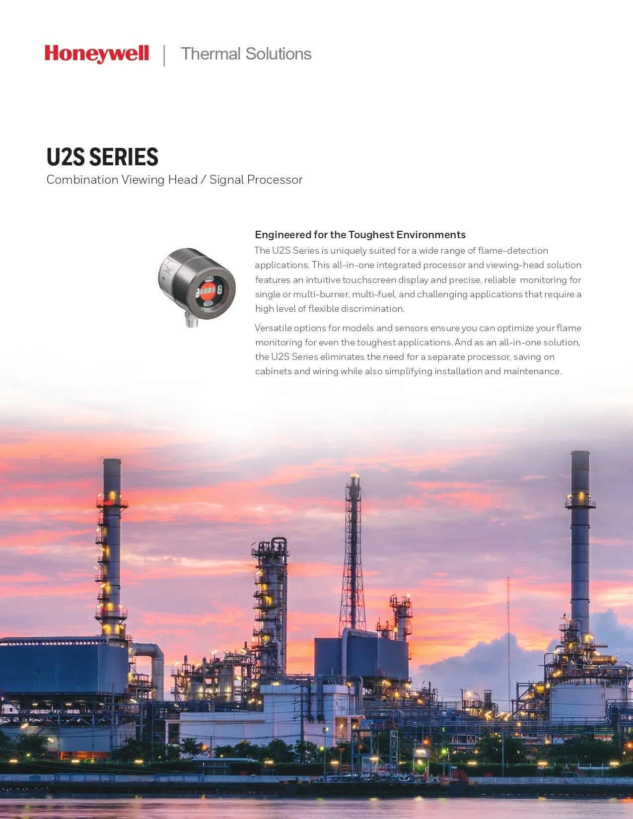 Honeywell Integrated UV Flame Monitor – U2S Series เป็นอุปกรณ์ตรวจจับเปลวไฟแบบ all‑in‑one ที่รวมทั้ง Viewing Head และ Signal Processor ในตัวเดียว เหมาะสำหรับ single หรือ multi‑burner systems ที่ใช้เชื้อเพลิงหลายชนิด (multi‑fuel) และสภาพการทำงานที่ยากต่อการตรวจจับเปลวไฟ โดยมีฟังก์ชัน self‑checking UV/IR sensor, touchscreen interface, และ programmable discrimination เพื่อให้การตรวจจับเปลวไฟ