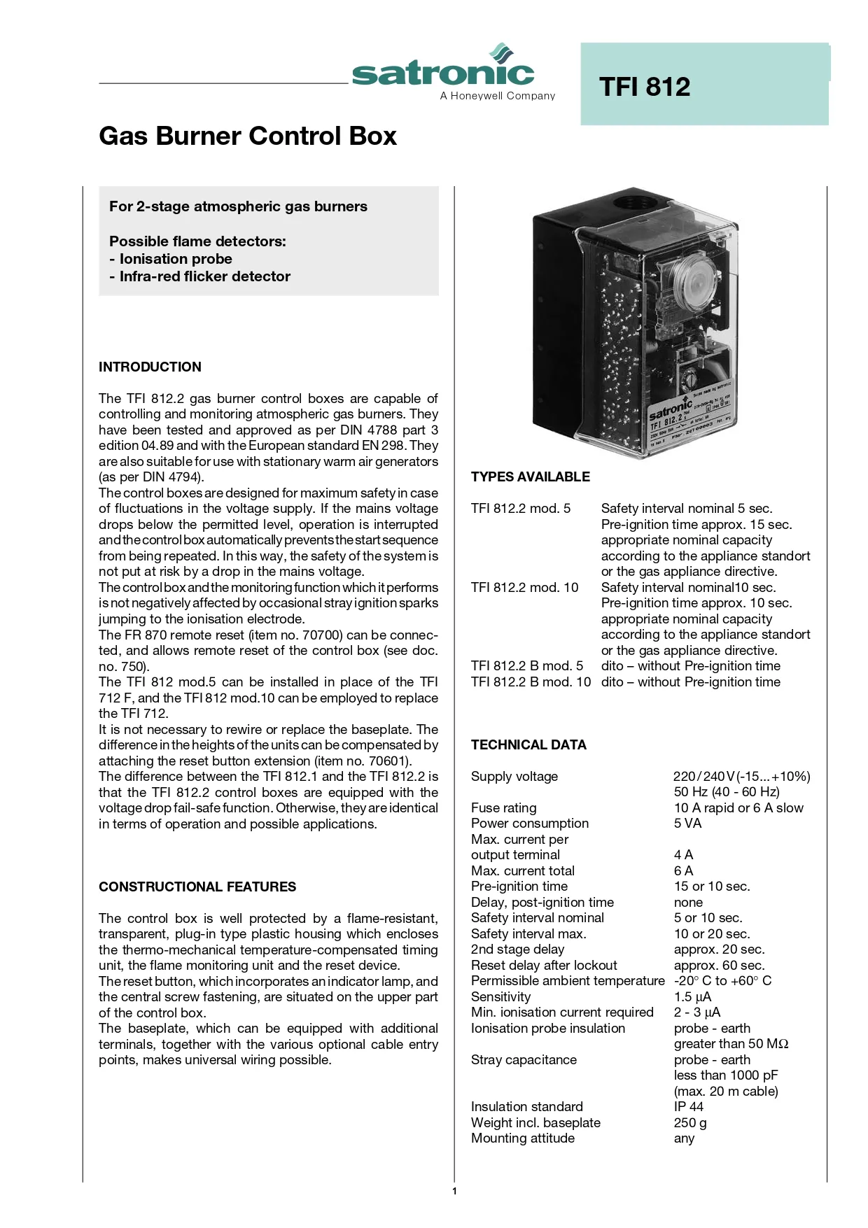 Honeywell Resideo Relay Satronic – TFI 812 Series (Gas Burner Control Units) เป็น Gas Burner Control Box ที่ออกแบบมาสำหรับหัวเผาแก๊ส 2‑stage รองรับทั้ง Ionisation Probe และ Infra‑red Detector มีระบบความปลอดภัยสูง ป้องกันการทำงานผิดพลาดจากแรงดันไฟฟ้าไม่เสถียร เหมาะสำหรับ Boilers, Furnaces และ Heating Systems