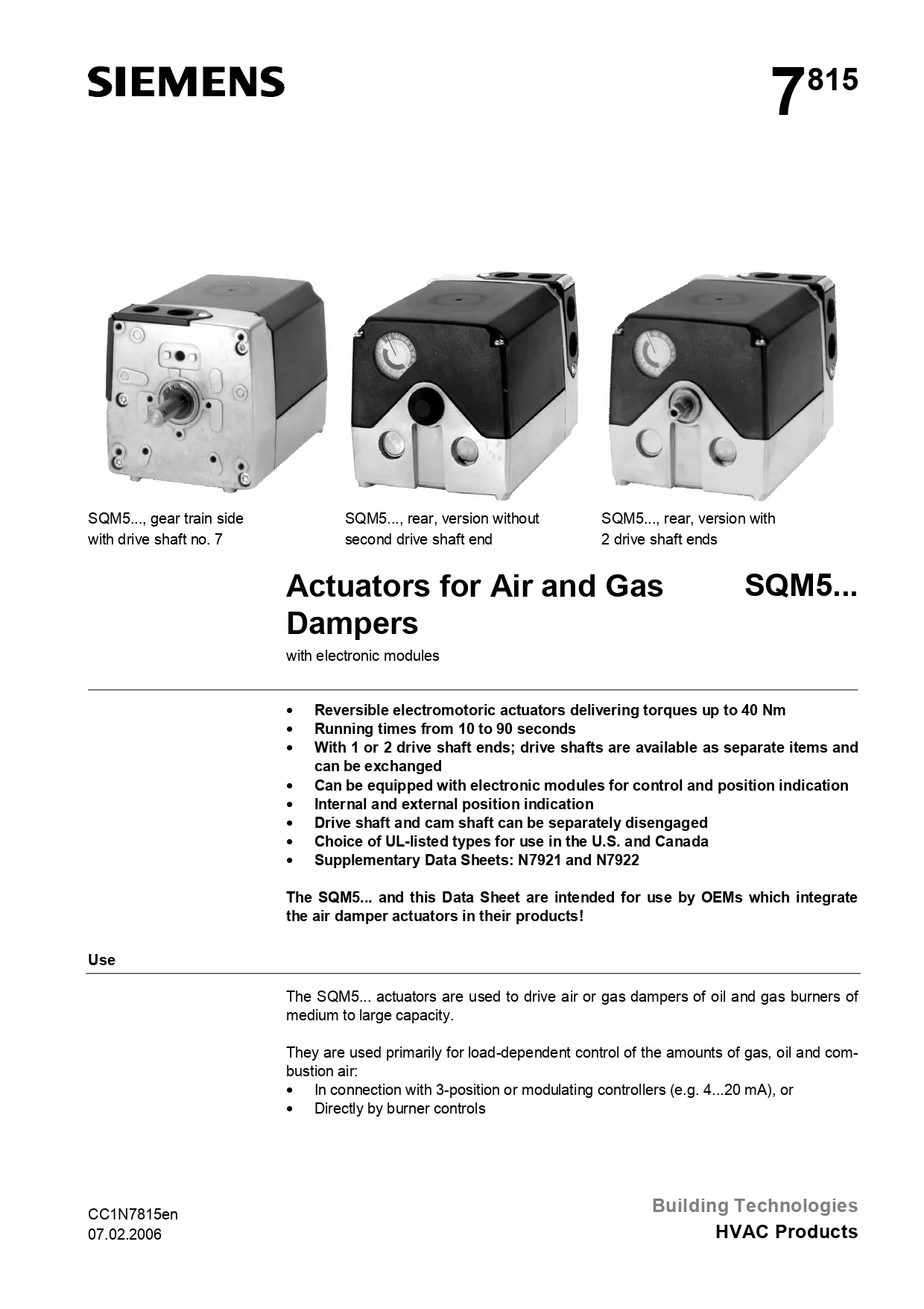 Siemens Actuators – SQM5 Series ซีรีส์ SQM5 เป็น positioning actuator ขนาดใหญ่และกำลังสูง ออกแบบมาสำหรับงาน combustion control systems ที่ต้องการแรงบิดสูงและการควบคุมตำแหน่งที่แม่นยำ ใช้ควบคุมการเปิด–ปิดและปรับตำแหน่งของ วาล์วก๊าซ, วาล์วอากาศ, หรือ dampers เพื่อให้ได้อัตราส่วนเชื้อเพลิง–อากาศที่เหมาะสม เหมาะสำหรับ boilers, furnaces และ process heating systems ที่มีขนาดใหญ่และต้องการความทนทาน