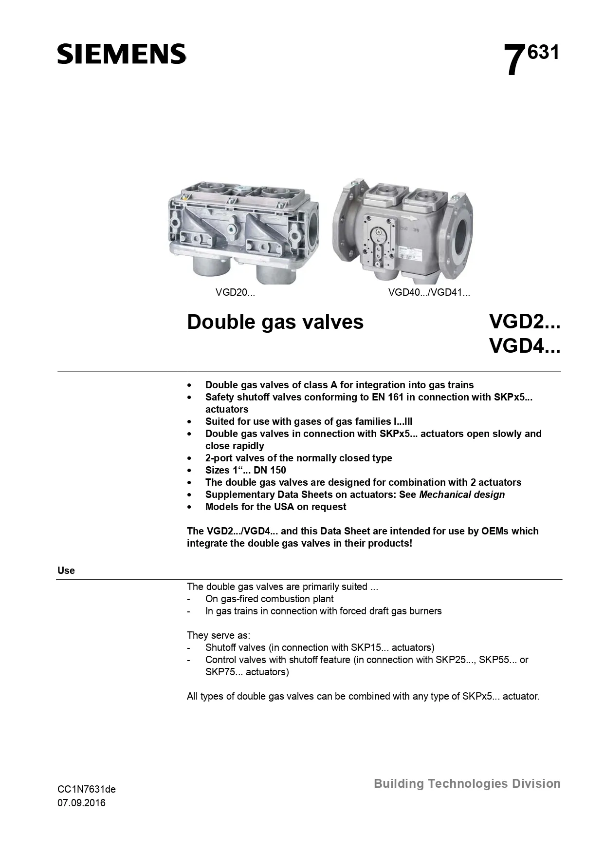 Siemens Double Gas Valve – VGD Series วาล์วแก๊สคู่ Siemens VGD Series เป็นวาล์วความปลอดภัยที่ใช้ในระบบหัวเผา (burner gas train) สำหรับ ควบคุมการจ่ายก๊าซเชื้อเพลิง โดยออกแบบให้มี สองวาล์วในตัวเดียว (double safety shut-off)
