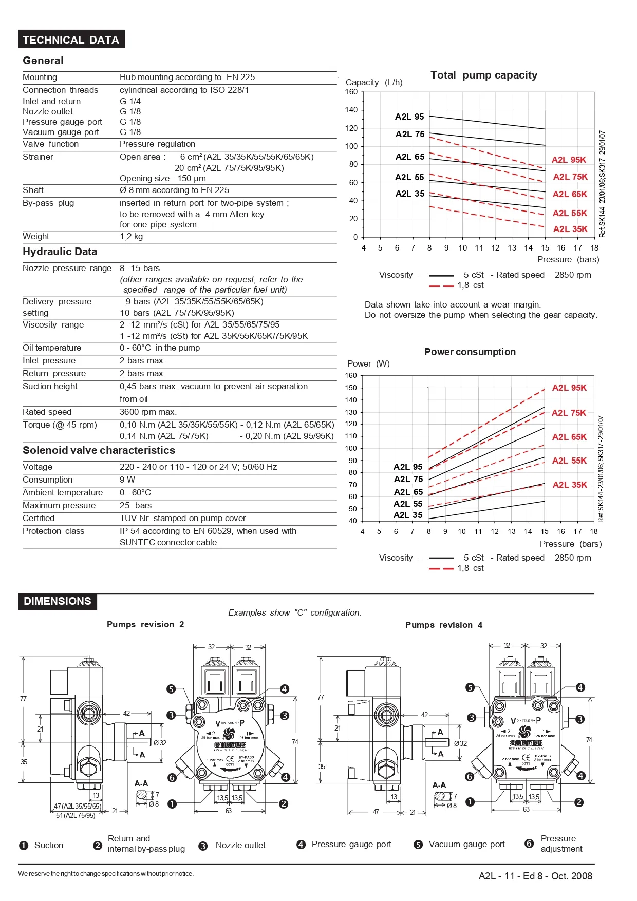 Suntec Oil Pump – A2L Series เป็นปั๊มน้ำมันเชื้อเพลิงแบบ two‑step model ที่มี 2 ช่องจ่ายน้ำมัน (two nozzle outlets) พร้อม โซลินอยด์วาล์วตัดการทำงานอิสระ 2 ตัว ใช้ควบคุมการจ่ายน้ำมันไปยังหัวฉีดอย่างแม่นยำ เหมาะสำหรับ Boilers, Furnaces และ Burners ที่ต้องการระบบจ่ายน้ำมันสองขั้นตอน (two‑stage operation) เพื่อเพิ่มประสิทธิภาพและความปลอดภัย