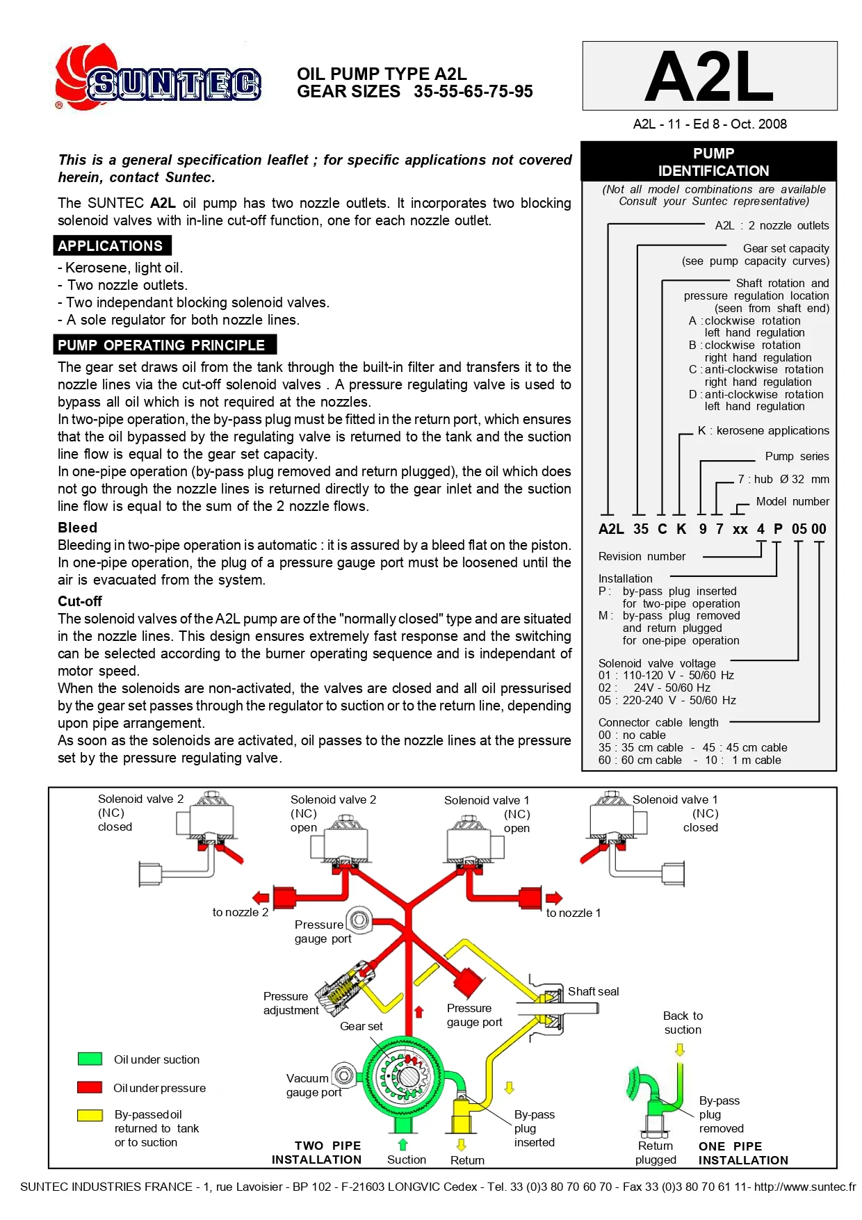 Suntec Oil Pump – A2L Series เป็นปั๊มน้ำมันเชื้อเพลิงแบบ two‑step model ที่มี 2 ช่องจ่ายน้ำมัน (two nozzle outlets) พร้อม โซลินอยด์วาล์วตัดการทำงานอิสระ 2 ตัว ใช้ควบคุมการจ่ายน้ำมันไปยังหัวฉีดอย่างแม่นยำ เหมาะสำหรับ Boilers, Furnaces และ Burners ที่ต้องการระบบจ่ายน้ำมันสองขั้นตอน (two‑stage operation) เพื่อเพิ่มประสิทธิภาพและความปลอดภัย