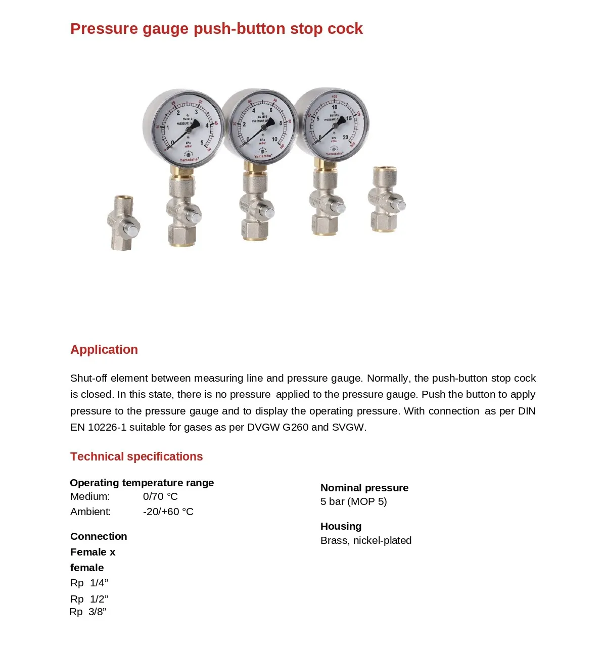 YAMATAHA – Pressure Gauge with Button Valve เป็นเครื่องวัดแรงดันที่มาพร้อม วาล์วปุ่มกด (Button Valve) สำหรับการตรวจสอบแรงดันแก๊ส/อากาศในระบบหัวเผาและท่อแก๊สอุตสาหกรรม โดยออกแบบให้สามารถ กดปุ่มเพื่ออ่านค่าแรงดันเฉพาะช่วงเวลา และป้องกันการรั่วไหลเมื่อไม่ได้ใช้งาน เหมาะสำหรับงานที่ต้องการการตรวจสอบแรงดัน